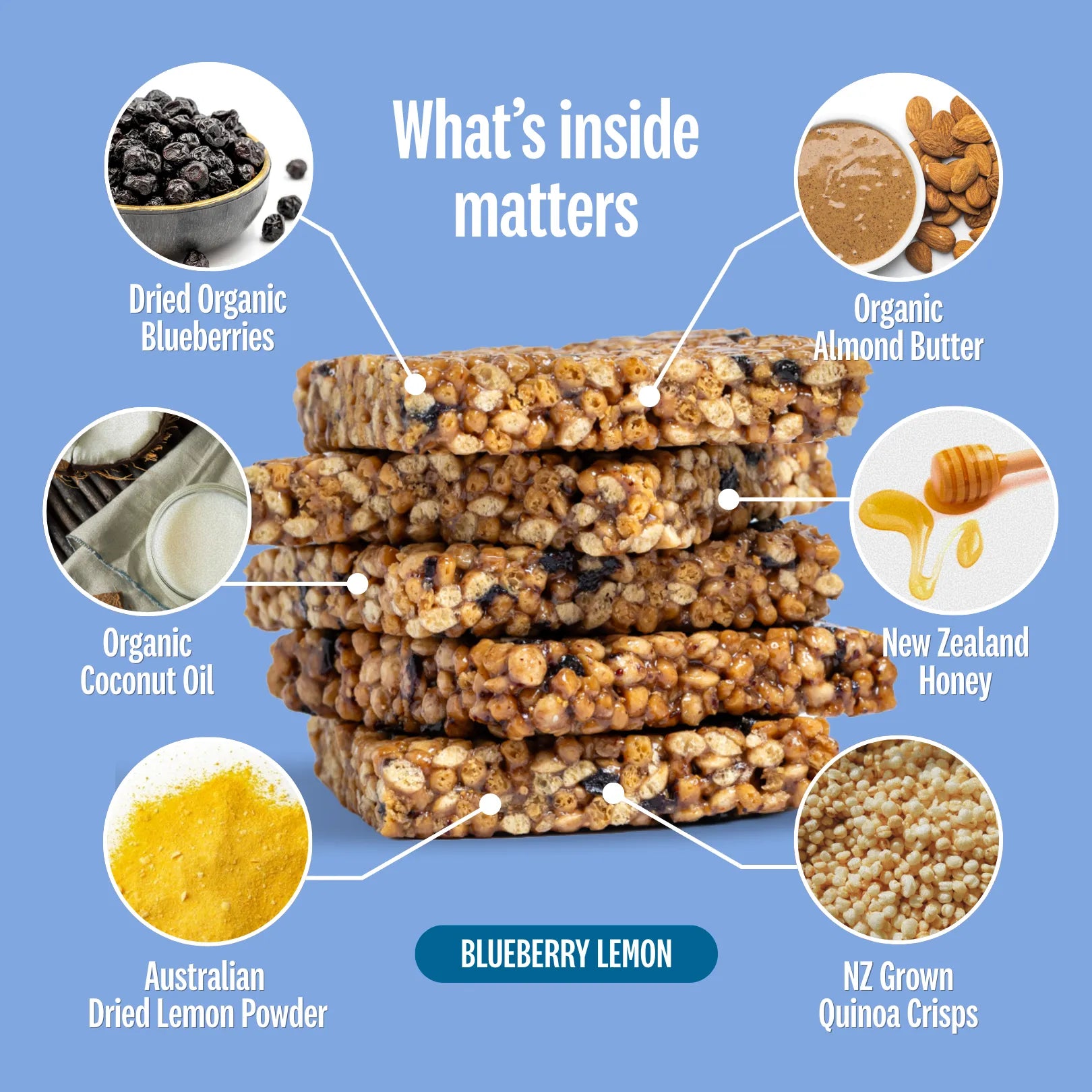 powered with NZ grown quinoa, NZ honey, organic blueberries.